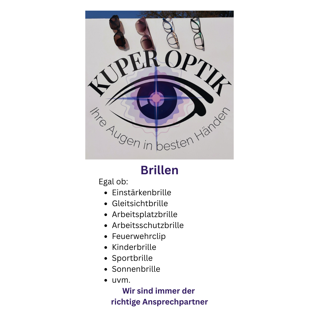 Bei Kuper Optik finden Sie eine große Auswahl an Brillen, Sonnenbrillen und Kontaktlinsen.